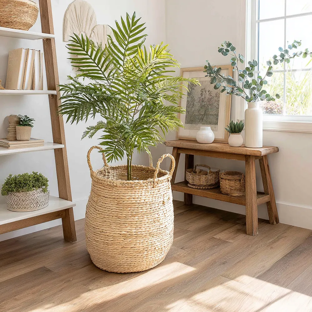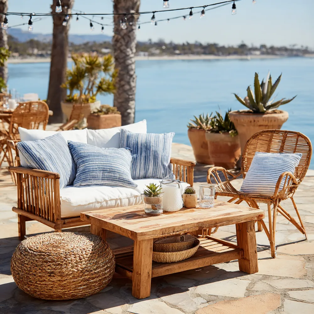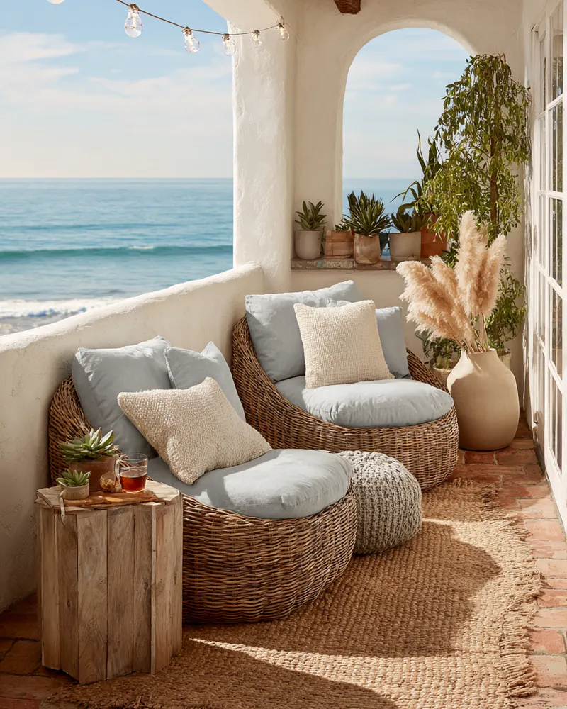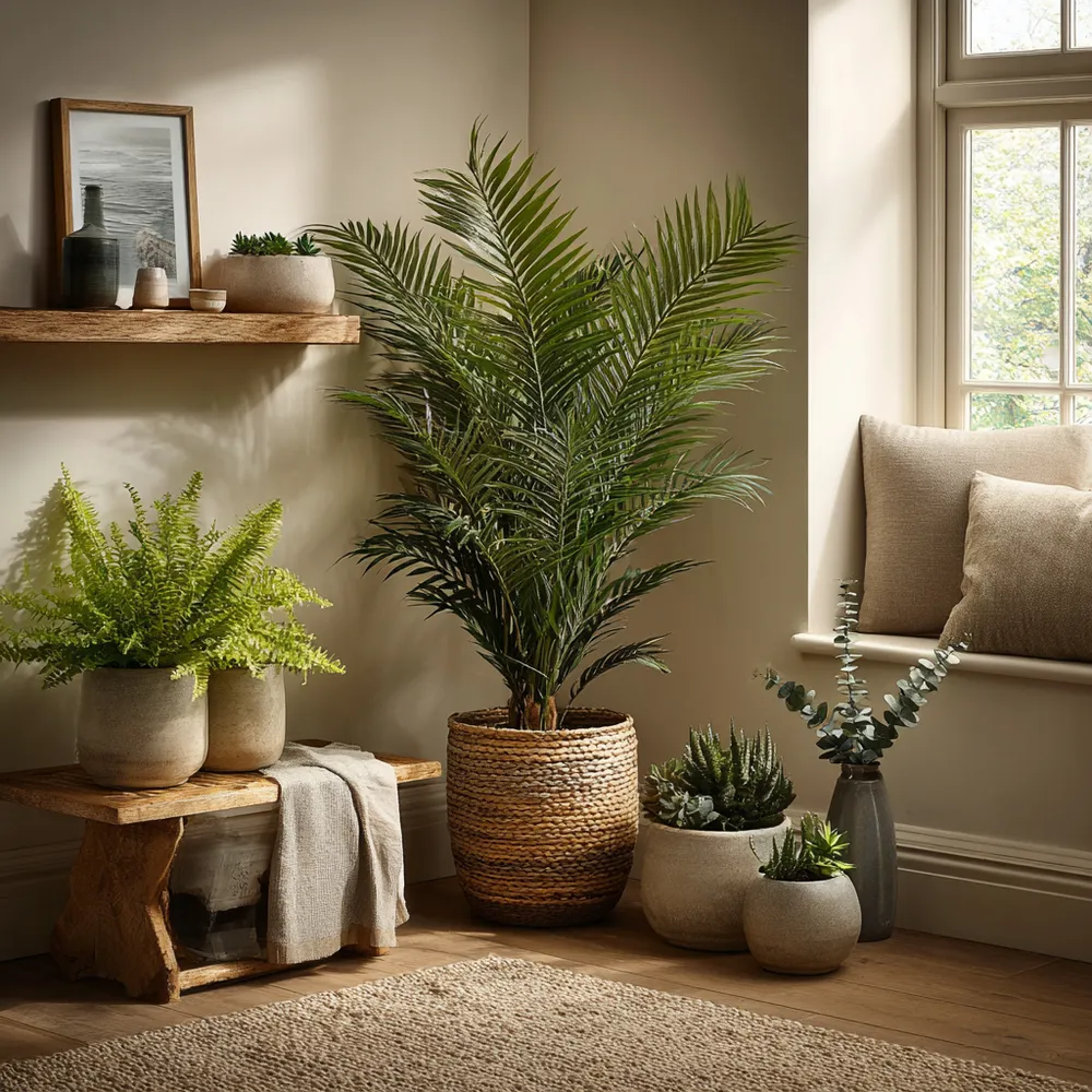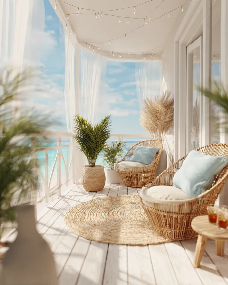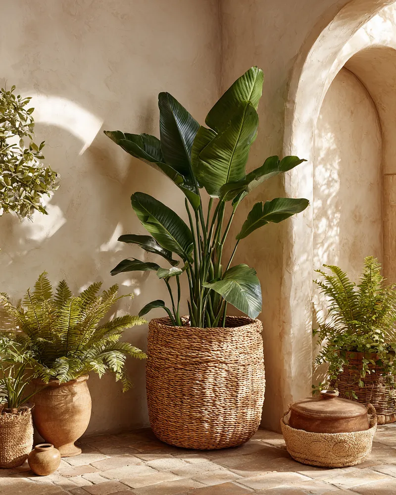 Large potted palms, seagrass plants, or even simple eucalyptus branches in a vase can evoke the beach. Choose planters that complement your coastal decor – natural materials like terracotta, woven baskets, or simple white ceramic pots.