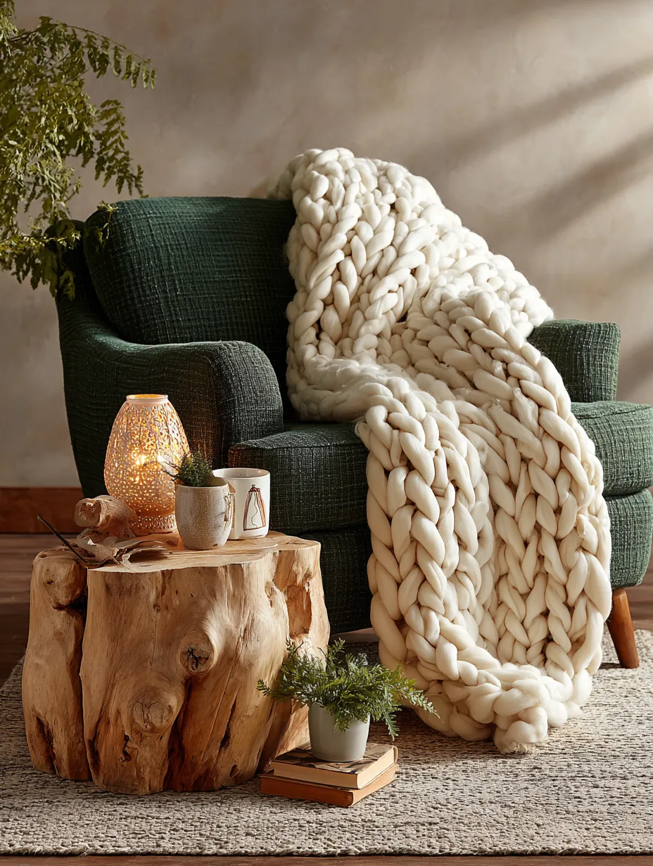 * **Natural Elements:** A small side table made of reclaimed wood, a scattering of dried leaves in a minimalist vase, or a small potted fern.