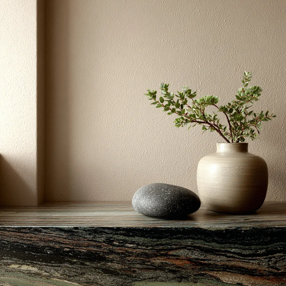 Inspired by the textures found on a forest floor, incorporating stones, pebbles, and natural ceramics adds an grounding and elemental feel to your home. These materials bring a tangible connection to the earth.