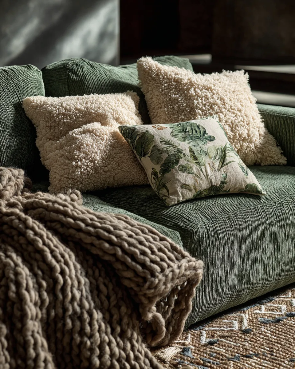 The 'Forest Floor Finds' aesthetic extends to your textiles! Opt for materials that mimic nature's softness, textures, and organic flow. These fabrics enhance comfort and connection to the natural world.