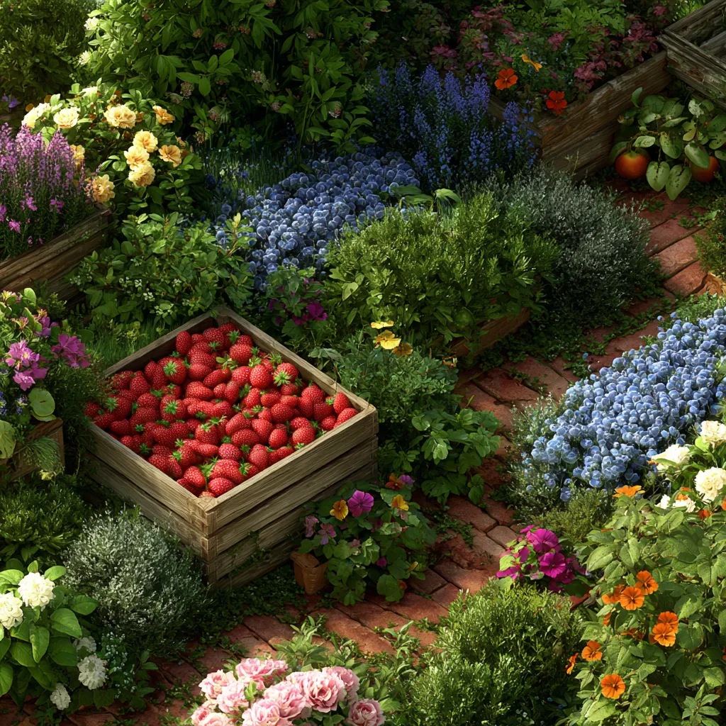 * **Fruiting Shrubs:** Blueberries and raspberries add color and fruit.