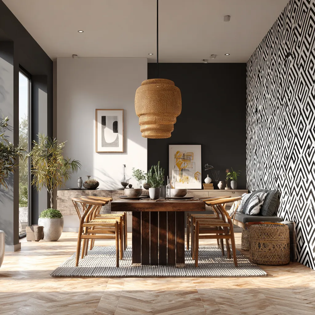 Ready to add some modern flair to your dining space? Geometric patterns are your best bet! 📐 They bring structure, energy, and a contemporary feel. Consider a geometric wallpaper accent wall, patterned placemats, or even a rug with bold geometric lines. These designs create visual interest and a sense of sophisticated order. Combine with clean-lined furniture for a cohesive look. Dinner parties just got an upgrade! ✨