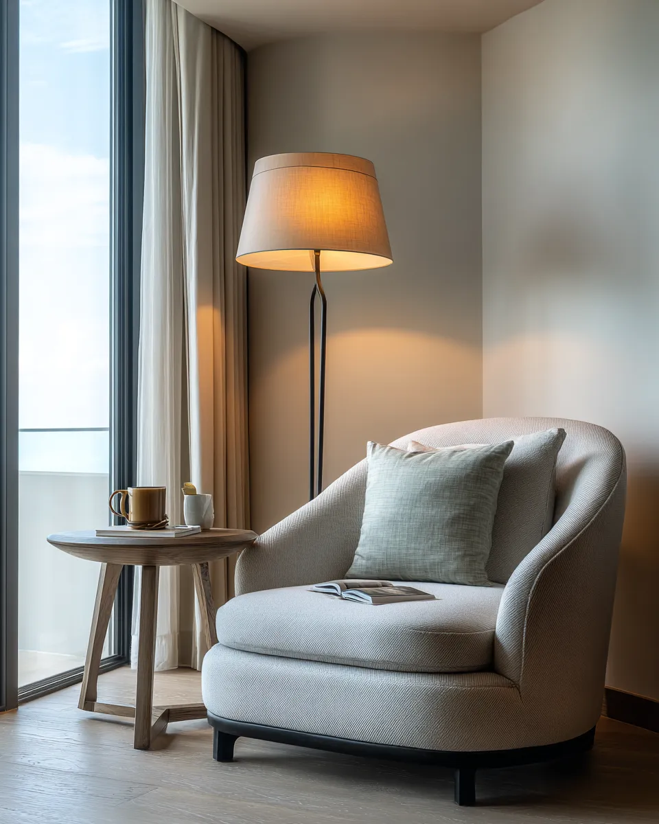 Transform a small nook into a sanctuary of calm with serene silhouettes and minimalist forms. 🕴️ Imagine a comfortable armchair with a soft, embracing curve, complemented by a simple side table and a strategically placed floor lamp casting a warm glow. This is about creating a visual respite, a space where form and function merge seamlessly to promote relaxation. Think natural materials, gentle lines, and pieces that feel intentionally chosen for their quiet beauty. It’s your personal oasis. Save for your calm corner inspiration! 🌿