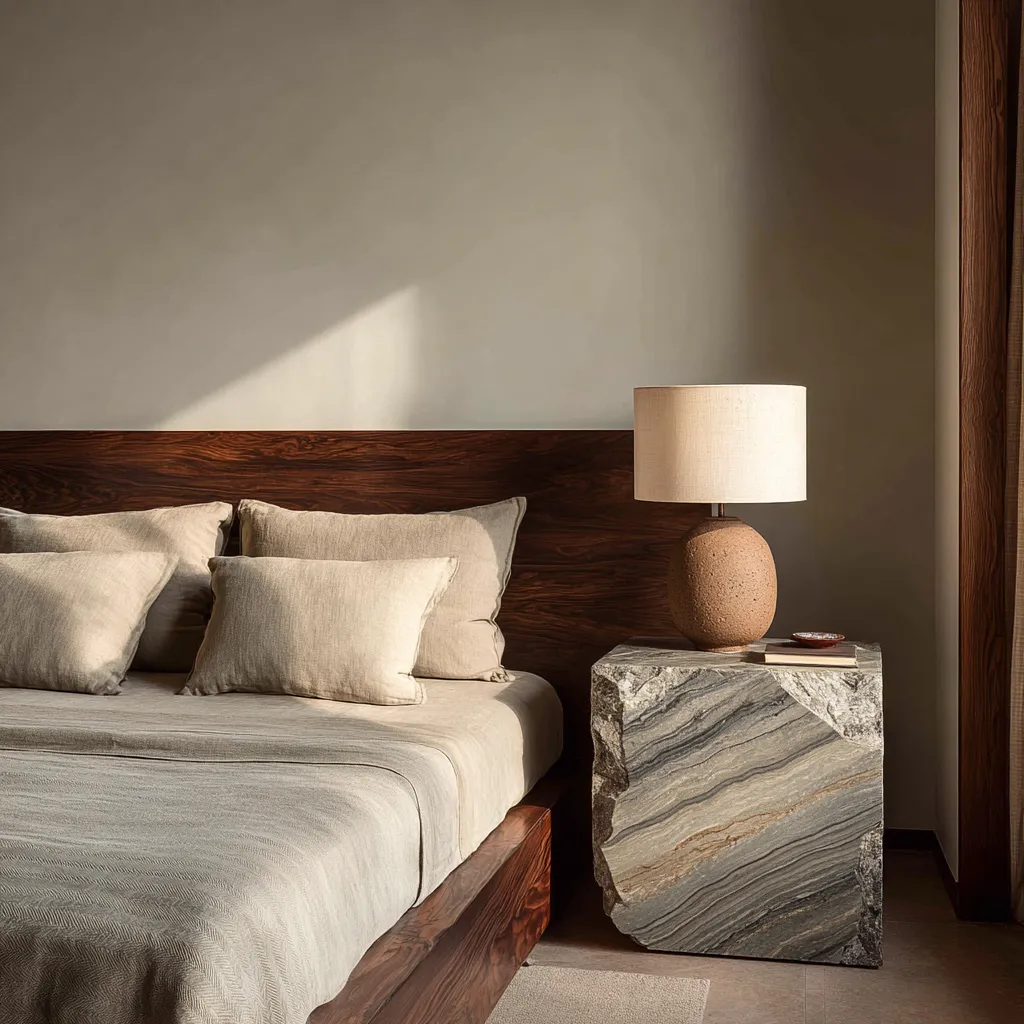 Imagine waking up in a sanctuary where the beauty of stone meets Japandi calm. It’s not about literal stone walls, but about subtle, tactile introductions. Consider a beautiful bedside table carved from a single piece of marble or a textured stone lamp base.