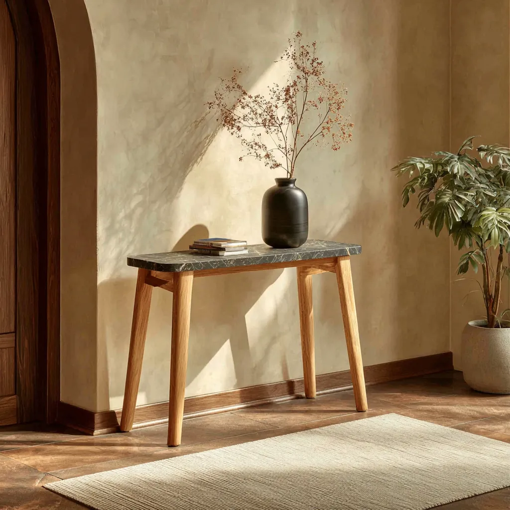 In Japandi design, every element should tell a story of natural beauty and quiet craftsmanship. A console table made from natural stone can be a stunning focal point. Imagine a slim profile, crafted from a material like polished granite or subtly veined marble, its surface cool and grounding.