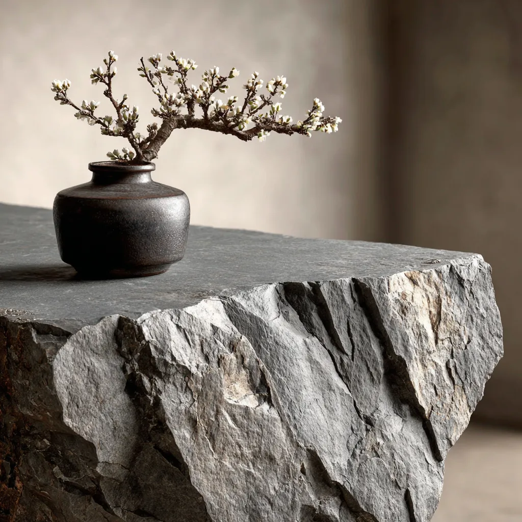 A deliberately ‘imperfect’ stone tabletop or a textured stone accent piece brings warmth and character.