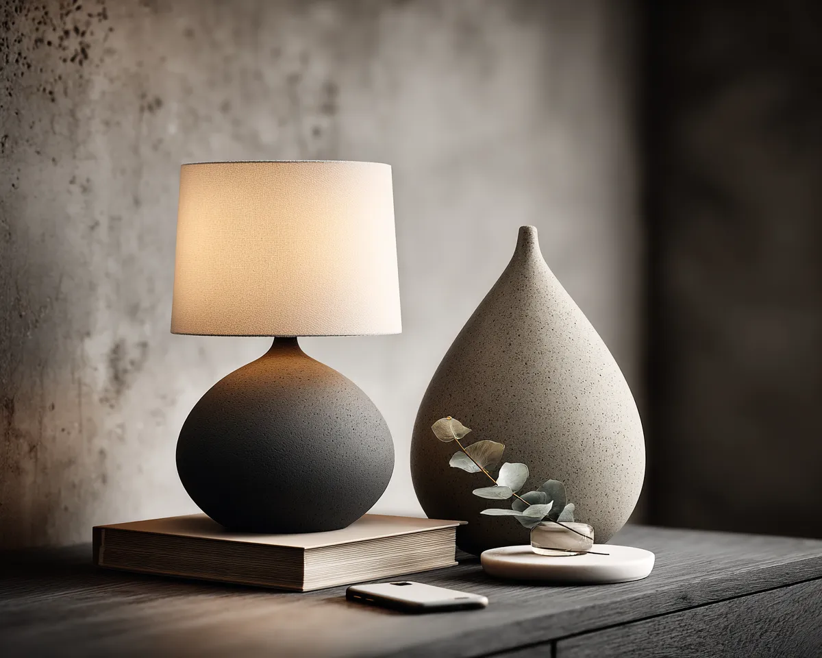 - A lamp with a clean, sculptural base (matte black or ceramic).