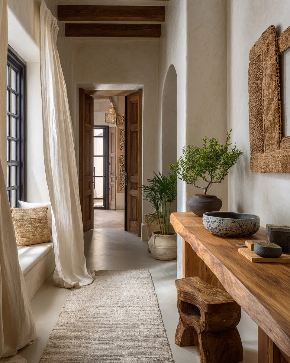 🌸 Incorporate a unique artisan piece – perhaps a hand-painted ceramic bowl for keys or a carved wooden stool.