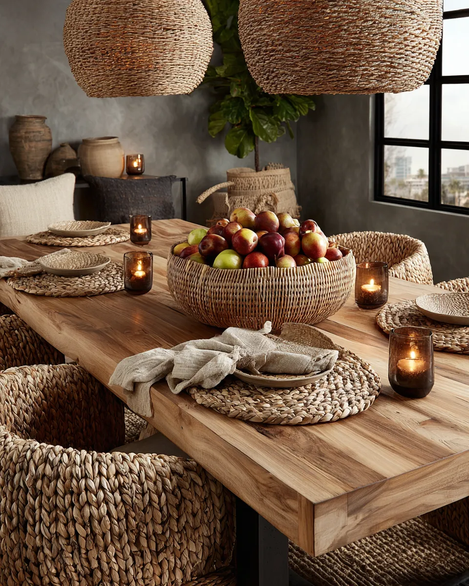 Elevate your dining experience with the natural beauty of woven basketry! 🌿 From placemats and chargers to serving baskets and decor, these global artisan pieces add instant bohemian flair and texture. Imagine a table set with natural woven chargers, a beautiful woven fruit bowl centerpiece, and perhaps a set of woven coasters. These elements bring an organic, earthy feel that makes every meal feel more special and grounded. It’s a simple yet impactful way to bring the 'Woven Worlds' into your home. Save for your next dinner party setup! ✨ #WovenDiningIdeas#BohoDiningIdeas#TableSettingIdeas#GlobalHomeDecorIdeas#BohemianDecorIdeas#PlacematIdeas#ServingBasketIdeas#NaturalTableware#HomeEntertaining#DecorStyling