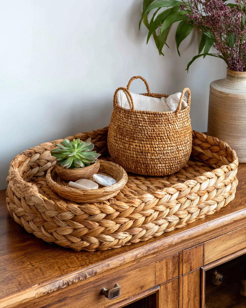 Give your console table a bohemian makeover with the charm of global woven pieces! ✨ It’s the perfect spot to display your collected treasures and add instant texture. Think a small woven tray for keys, a charming woven planter for a touch of green, or even a collection of different sized woven bowls for storing small items. These natural elements bring an artisan touch that feels both sophisticated and grounded. A few well-chosen woven pieces can completely transform this often-overlooked surface. Save for your console table styling! 💫 #WovenConsoleIdeas#BohoConsoleIdeas#ConsoleTableStylingIdeas#GlobalAccentsIdeas#BohemianHomeDecorIdeas#EntrywayDecor#TrayDecor#WovenPlanterIdeas#DecorStylingTips#HomeAccessories