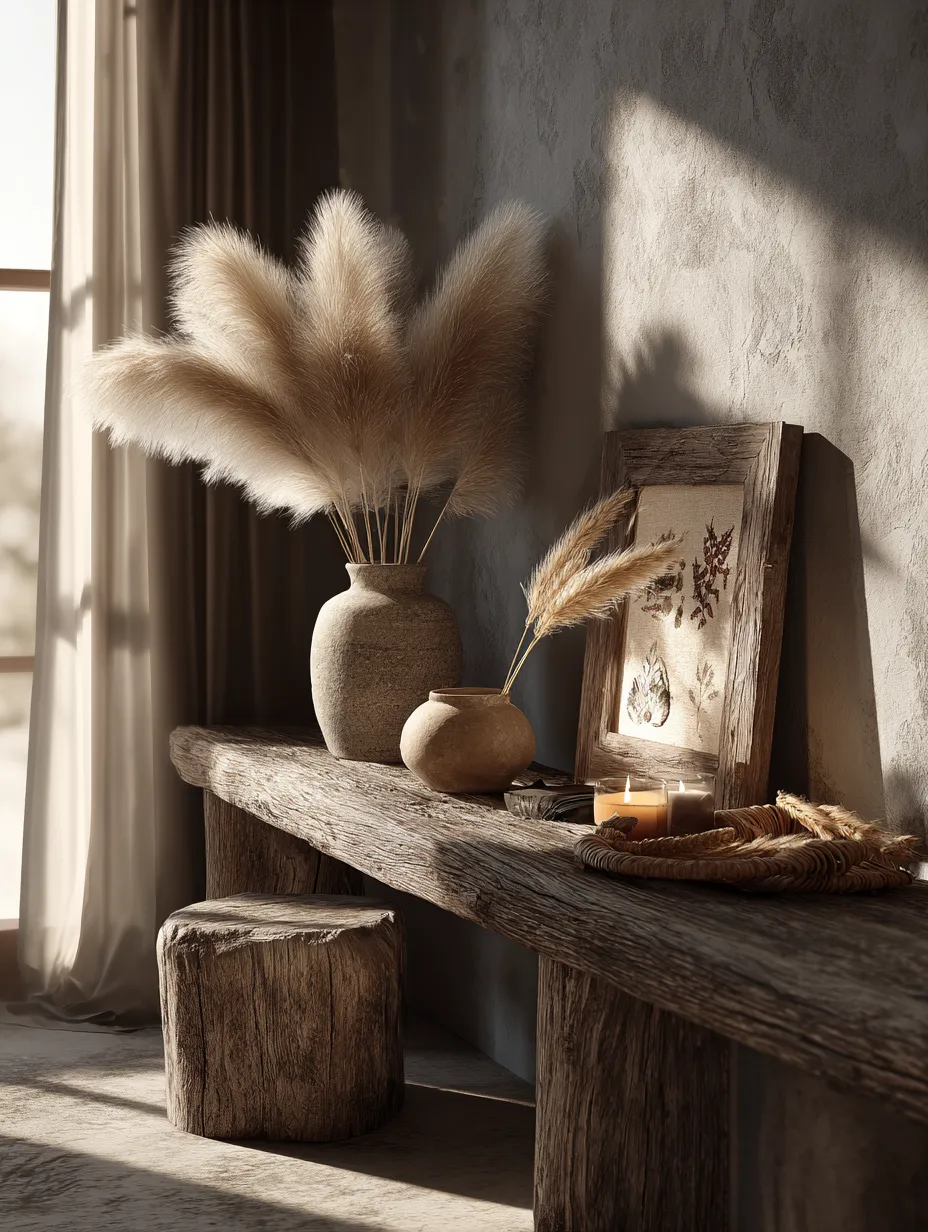 Bring the quiet beauty of nature indoors by styling with dried botanicals, paired with the rich narrative of folk art. This combination creates a deeply serene and historically resonant atmosphere, adding texture and soul to your space.