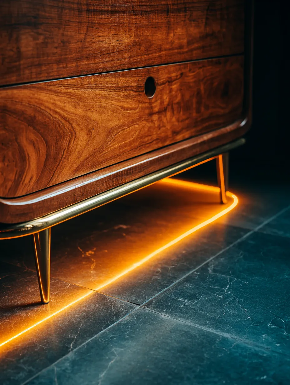 O metal adiciona um toque de sofisticação e glamour! ✨ No design mid-century, detalhes em latão escovado, cobre ou cromo complementam perfeitamente a madeira e trazem um brilho sutil. Pense em pés de móveis, luminárias, molduras de espelhos ou puxadores de armários. 💡 Esses toques metálicos adicionam profundidade e um ar de requinte atemporal ao ambiente. Eles capturam a luz e dão vida a cada canto. Salve para adicionar esse brilho especial à sua decoração!