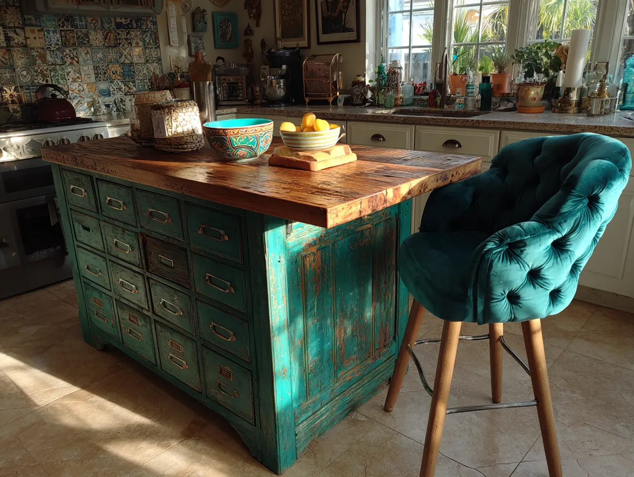 Your kitchen island is more than just prep space – it's a style statement! 💥 Dare to be different by infusing eclectic charm. Think beyond standard cabinetry; opt for a vintage apothecary cabinet repurposed as an island, or a butcher block top on a boldly colored base. Mix seating with contrasting stools – perhaps industrial metal stools alongside a velvet bench. It’s about blending practical function with a generous dose of personality. Make your kitchen a true heart of the home that reflects your unique aesthetic! 💖 #EclecticKitchenIslandIdeas#KitchenDesignIdeas#UniqueKitchenIdeas#HomeDecorIdeas#DareToBeDifferentIdeas#KitchenInspo#IslandDesign#DecorStyle#FunctionalDecor#StylishKitchen