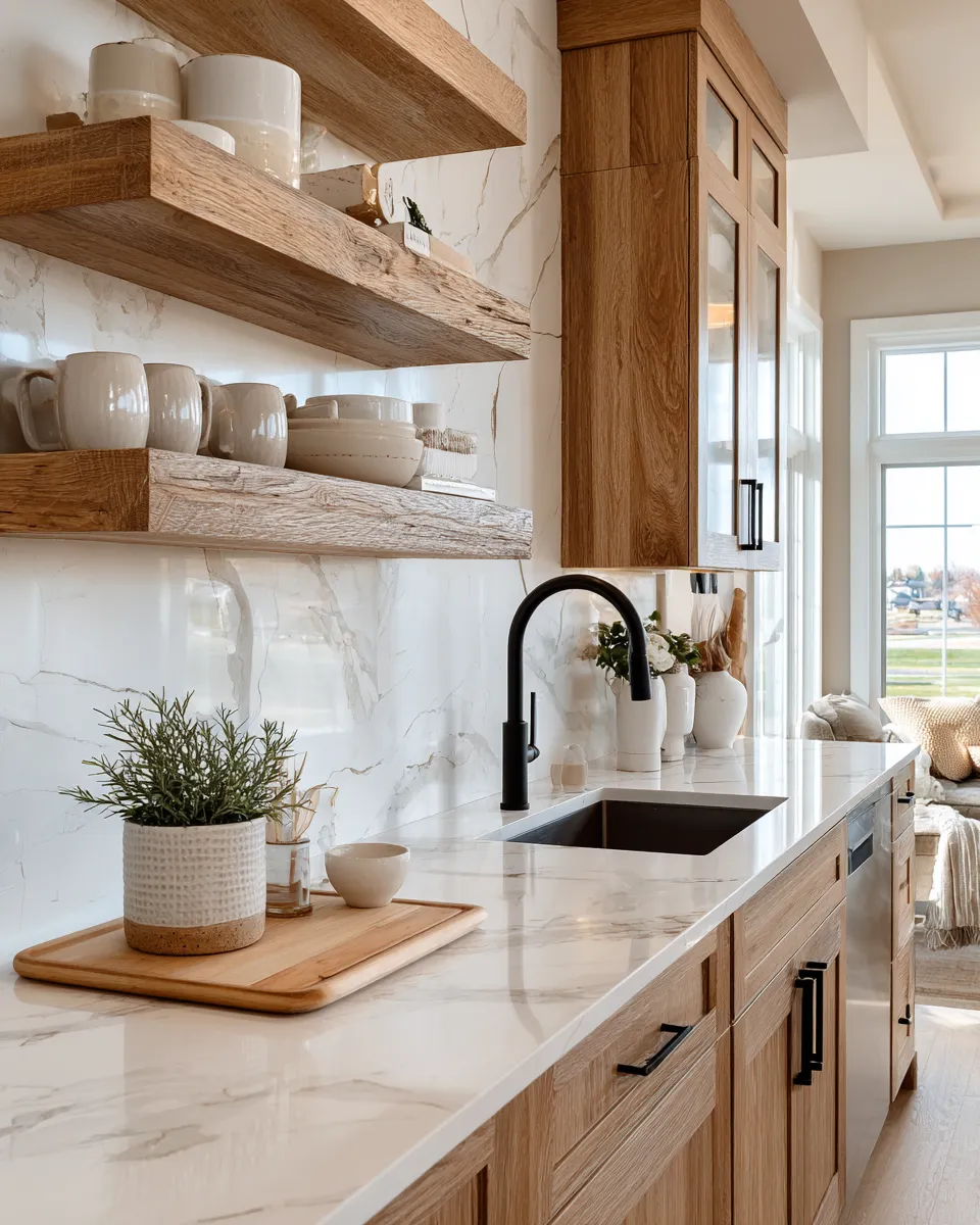 Transform your kitchen with modern farmhouse flair! 🌾 We’re talking a perfect blend of rustic textures and clean, modern functionality. Think simple shaker cabinets in a neutral tone, mixed with warm wood open shelving displaying curated stoneware. A touch of black hardware adds a modern edge, while natural light keeps the space feeling airy. It’s about creating a kitchen that’s both beautiful to look at and a joy to cook in. Save these ideas for your kitchen renovation! ✨
