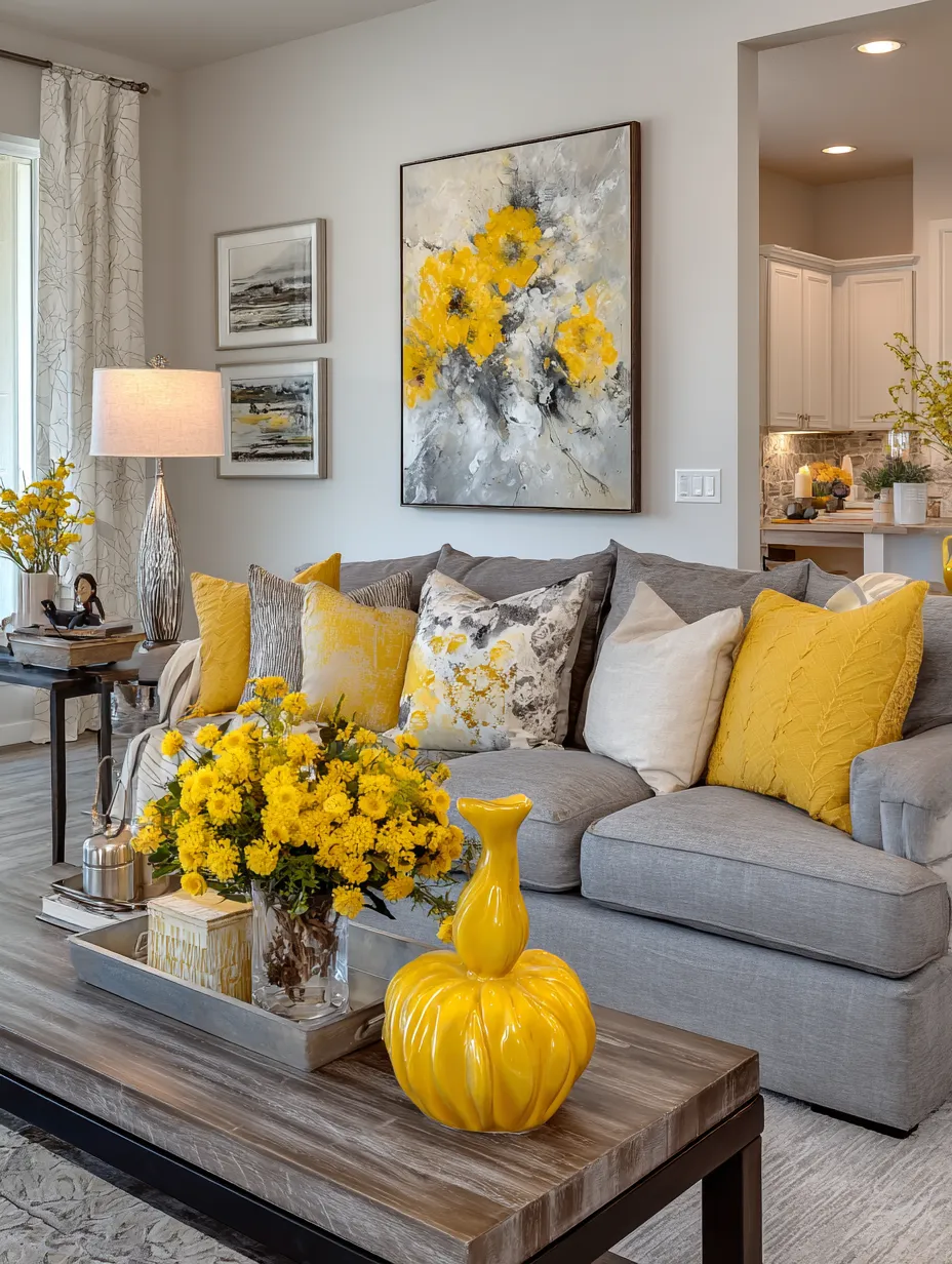 * **Accent Pillows:** Bright yellow cushions on a neutral sofa.