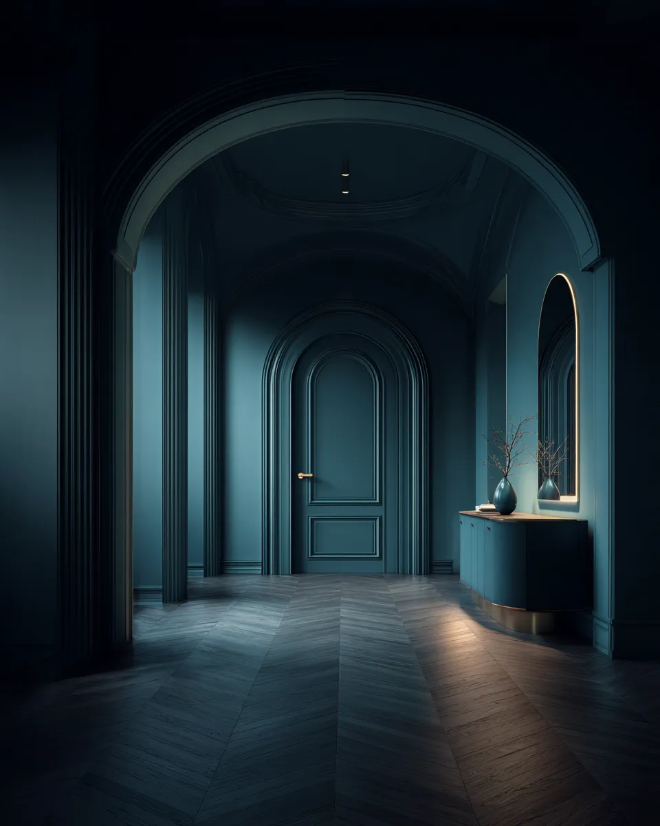 Make a memorable first impression with a dramatic and sophisticated entryway in rich teal. This deep, luxurious color evokes a sense of calm, elegance, and mystery, instantly transforming a transitional space into a statement. It's bold, beautiful, and perfect for setting a sophisticated tone for your home.
