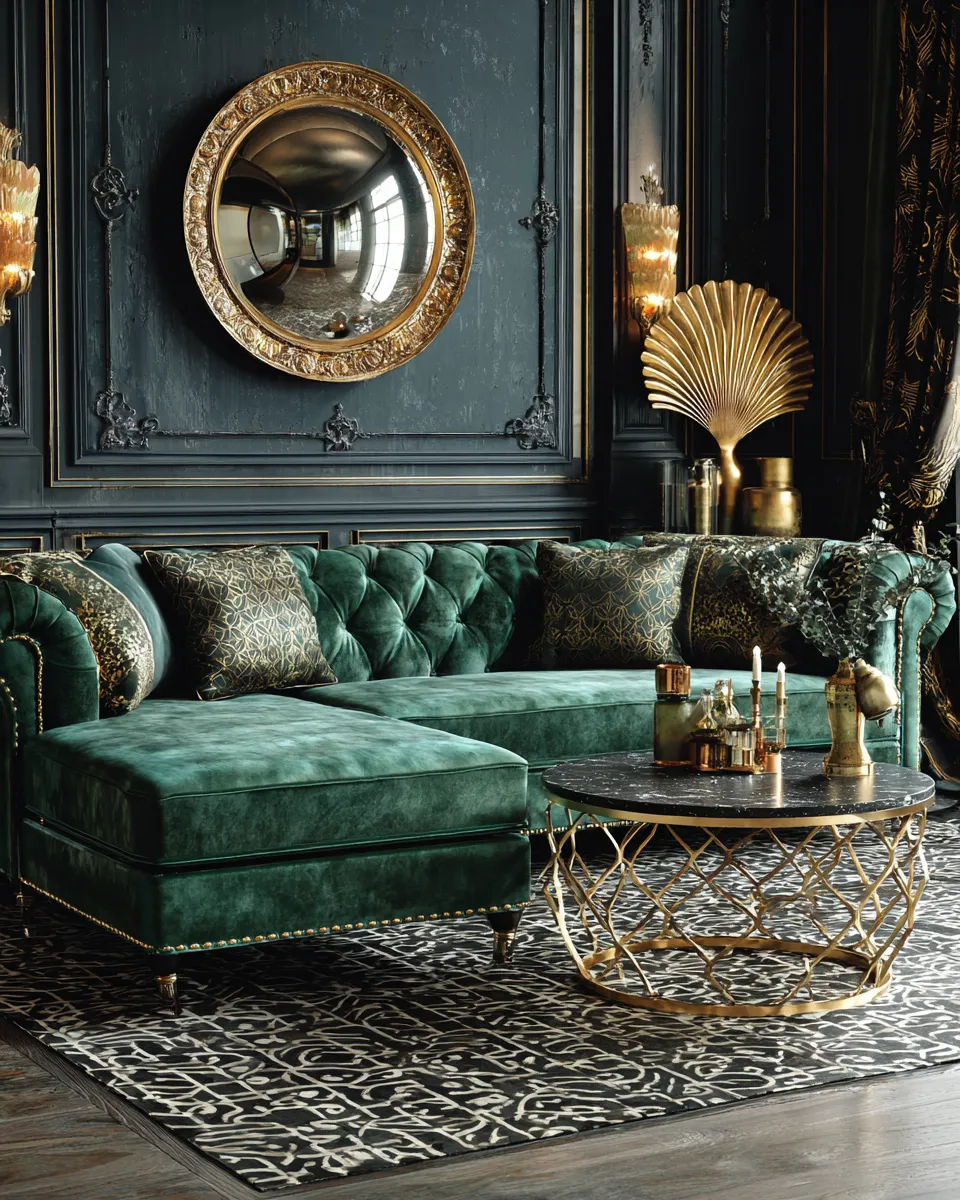- **Luxurious Materials:** Velvet upholstery, brass accents, marble finishes.