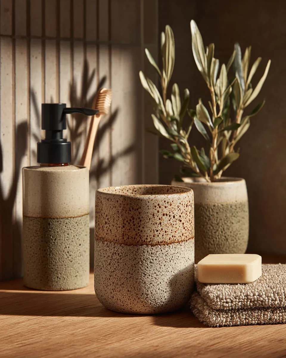 Save this for your bathroom refresh ideas! #WabiSabiBathroomIdeas#CeramicDecor#BathroomDesign#HomeDecorInspo#TexturedCeramics#NaturalTones#MindfulSpaces#HandmadeBath#SpaLike#DecorTips