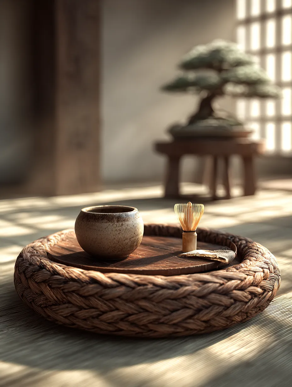 * **Natural Materials:** A simple wooden tray, ceramic tea ware with organic shapes, and a bamboo tea whisk.