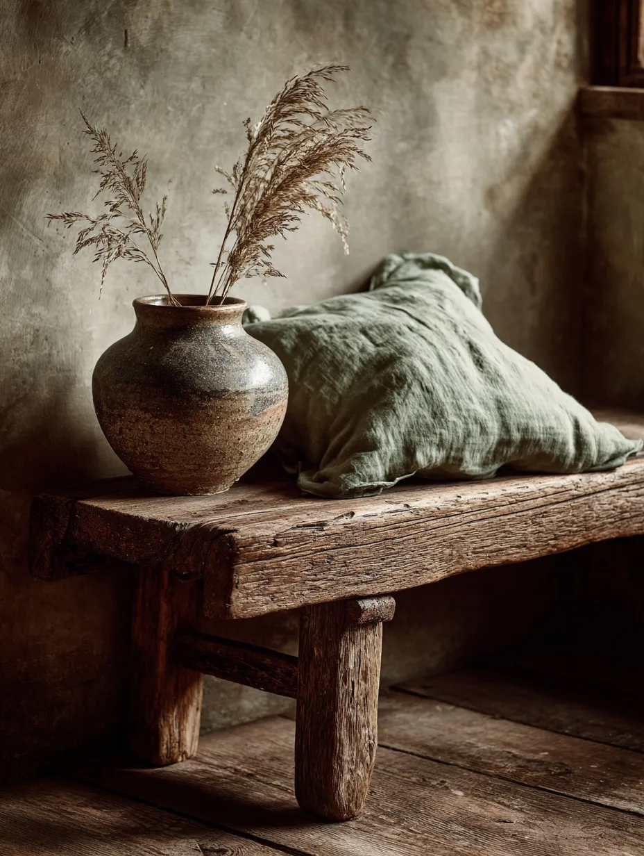 * **Earthy Textures:** Use raw wood, aged linen, handmade ceramics, and unpolished stone.