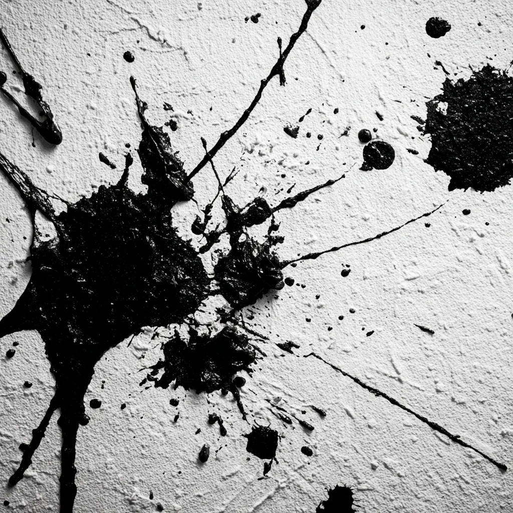 * **Color Contrast:** Black splatters on white, or vibrant colors on a neutral background.