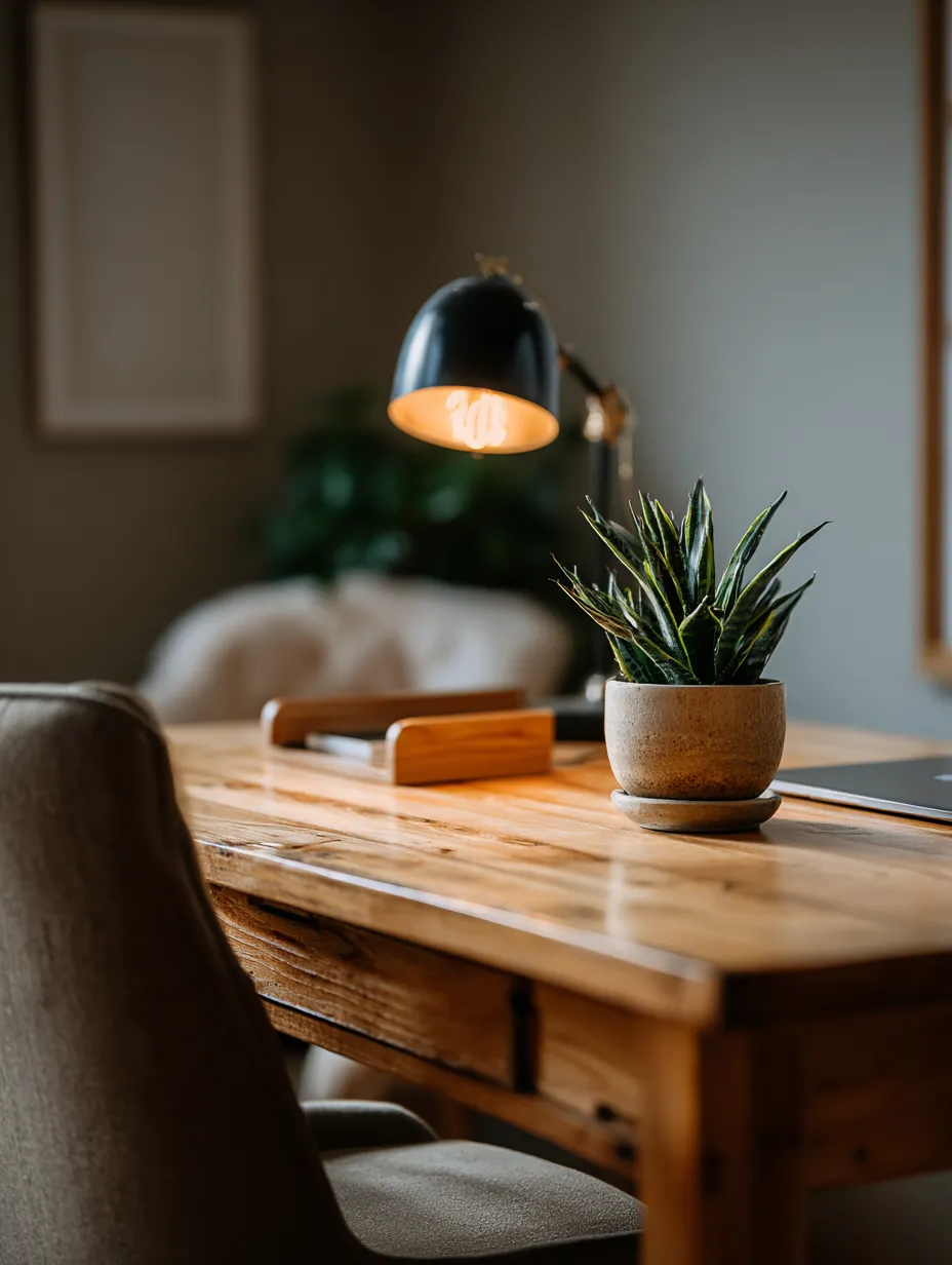 * **Natural Wood:** A simple wooden desk or a bamboo organizer adds warmth and texture.