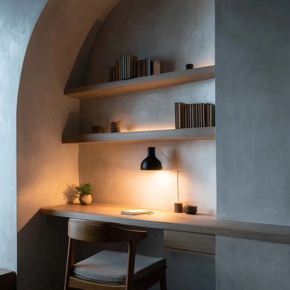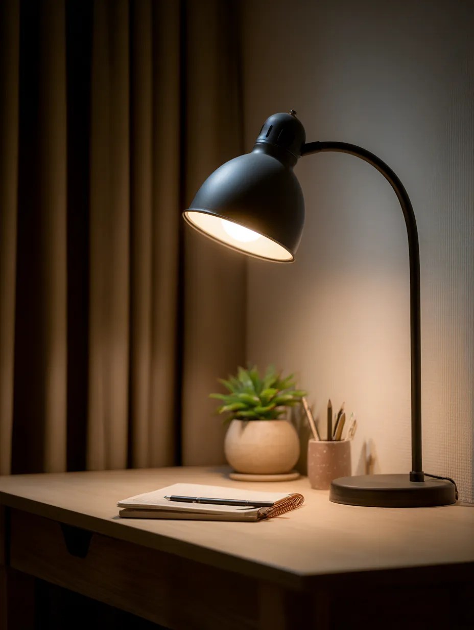 * **Soft, Task Lighting:** A simple desk lamp with warm, adjustable light is key for evening work.