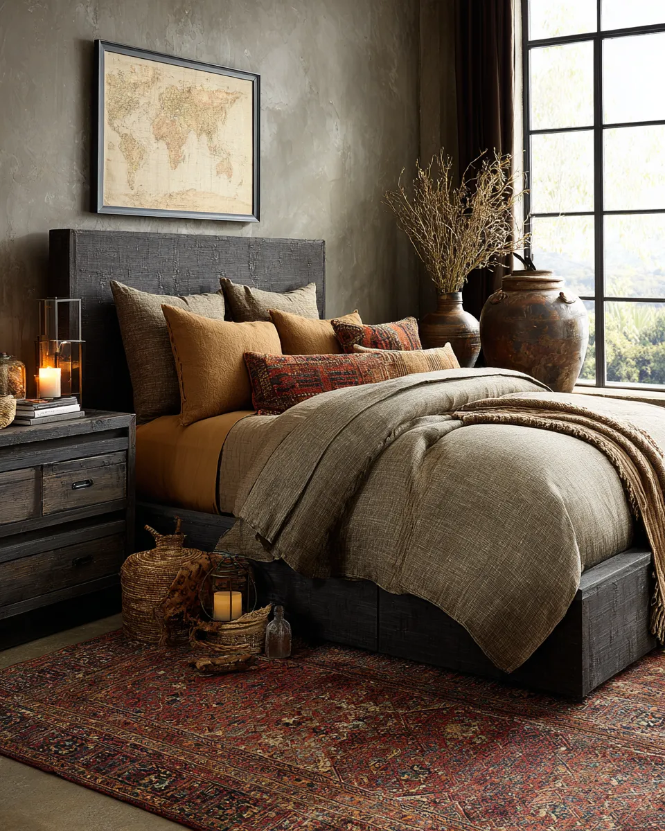 Industrial Edge: Gunmetal Grey & Ochre for a Moody Bedroom! 🖤💛