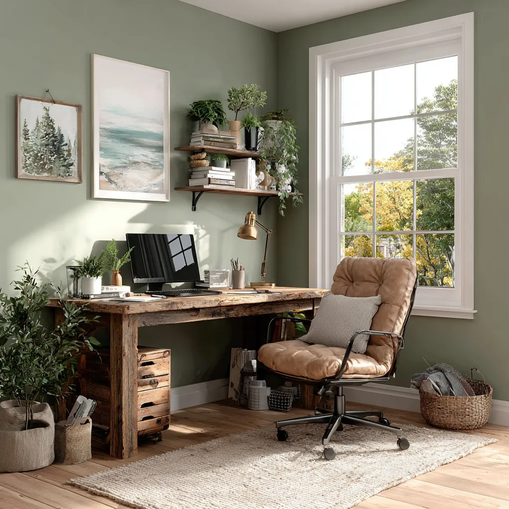 * **Natural Decor:** Plants, wooden desk accessories, and perhaps framed nature prints.