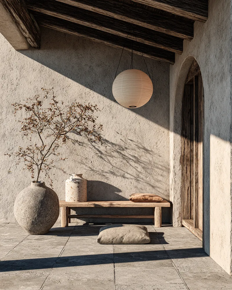 * **Warm, Ambient Lighting:** A lantern-style fixture or a lamp with a natural shade.