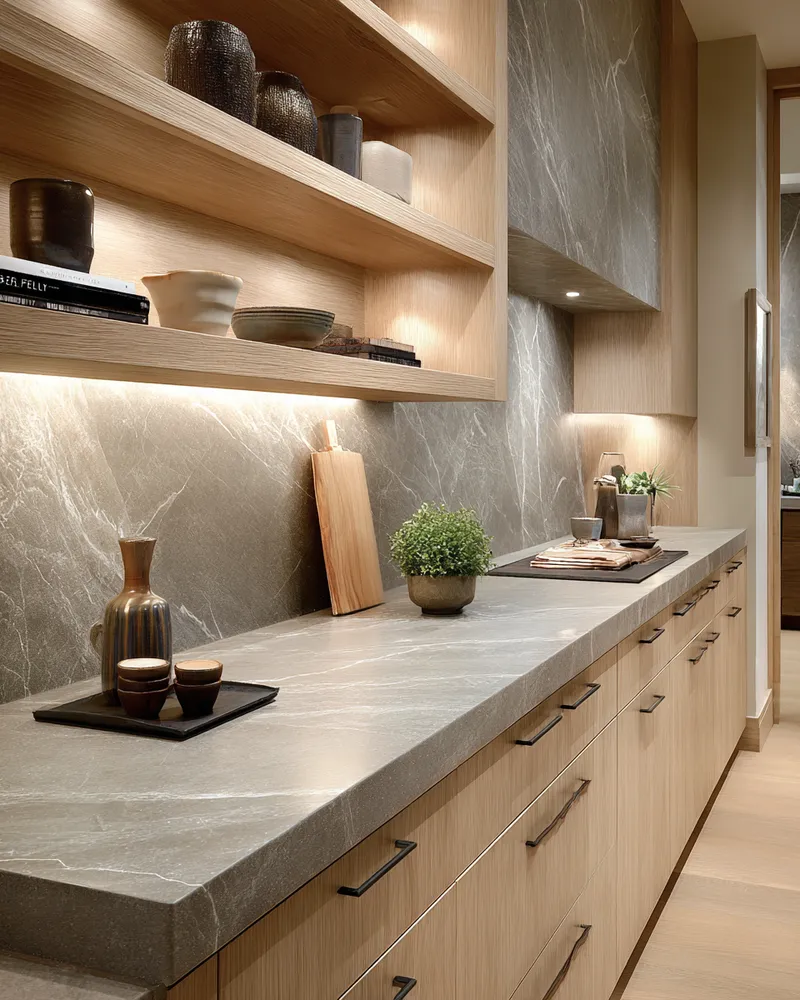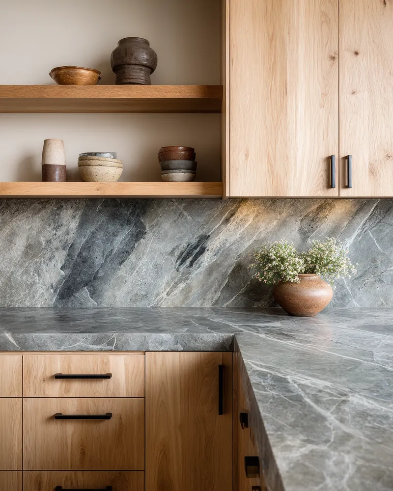 * **Stone Accents:** Granite, slate, or concrete countertops add organic texture.