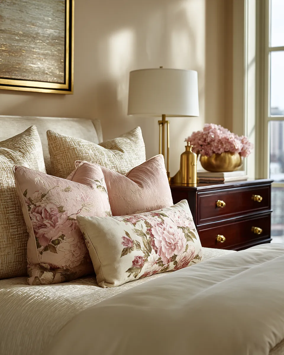 🌸 The Glamorous Bloom: Brass Accents in a Floral Bedroom Oasis! ✨