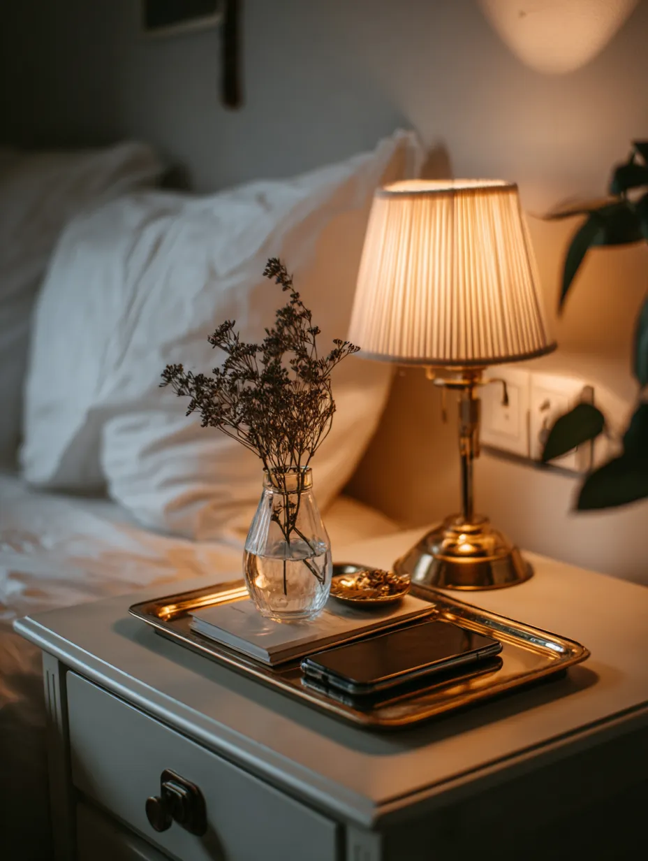 🌸 Polished Petals: Brass Accents for a Chic Bedroom Nightstand! ✨
