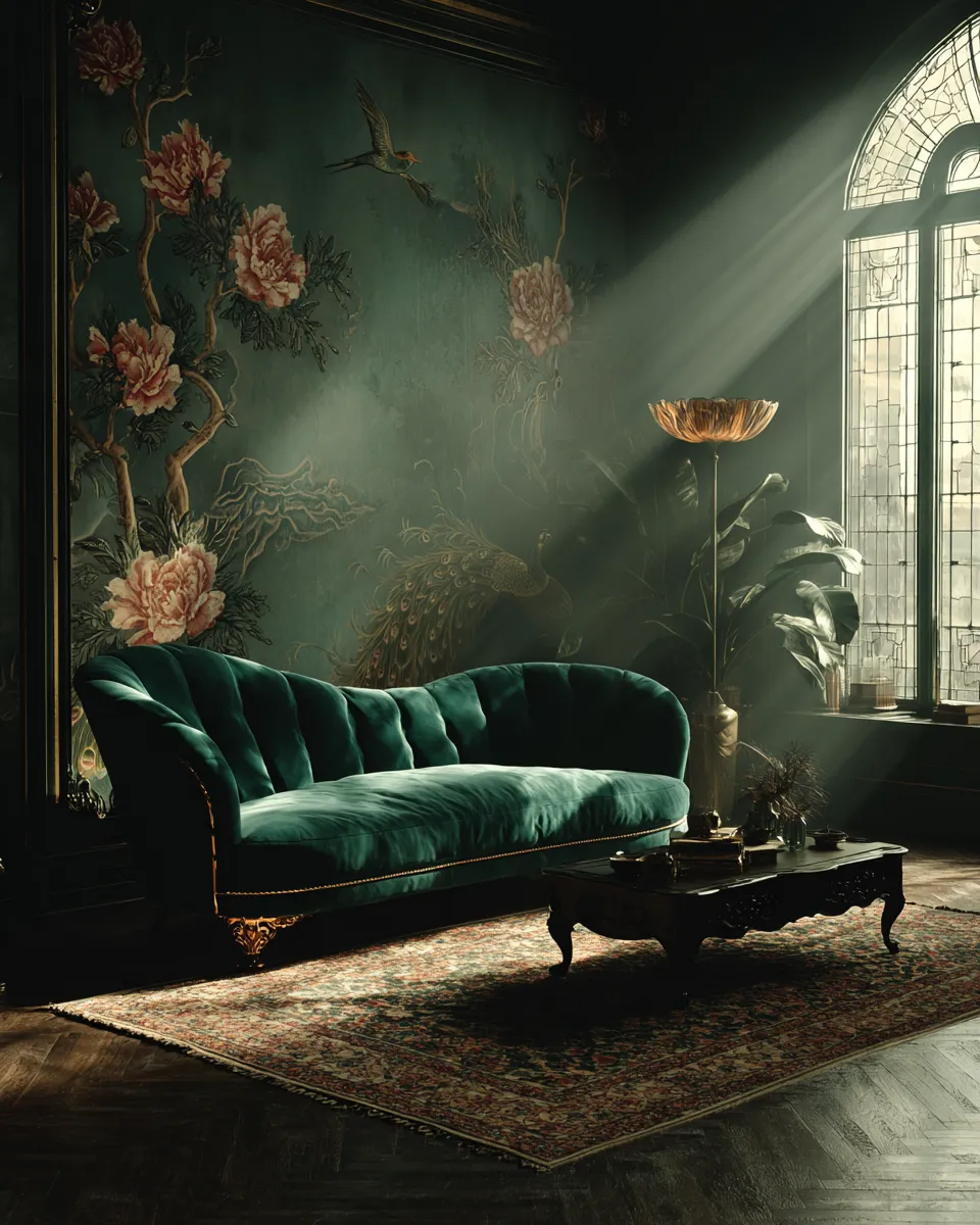 * **Rich Materials:** Dark woods, bronze accents, jewel-toned velvets.
