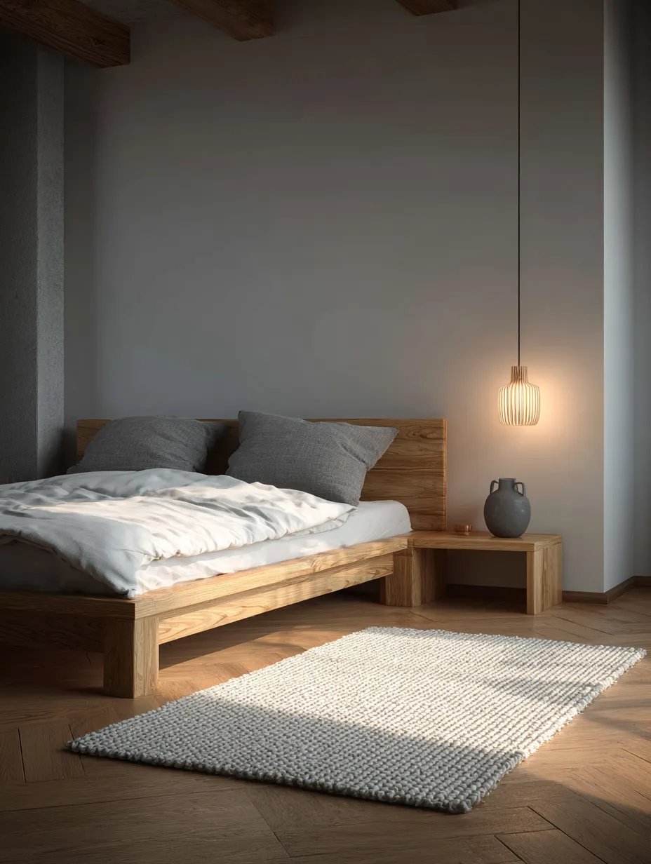 Focus on a limited color palette – think soft whites, warm greys, and muted earthy tones. Choose furniture with clean lines and a low profile. A simple wooden bed frame, a floating nightstand, and integrated storage keep the space uncluttered.