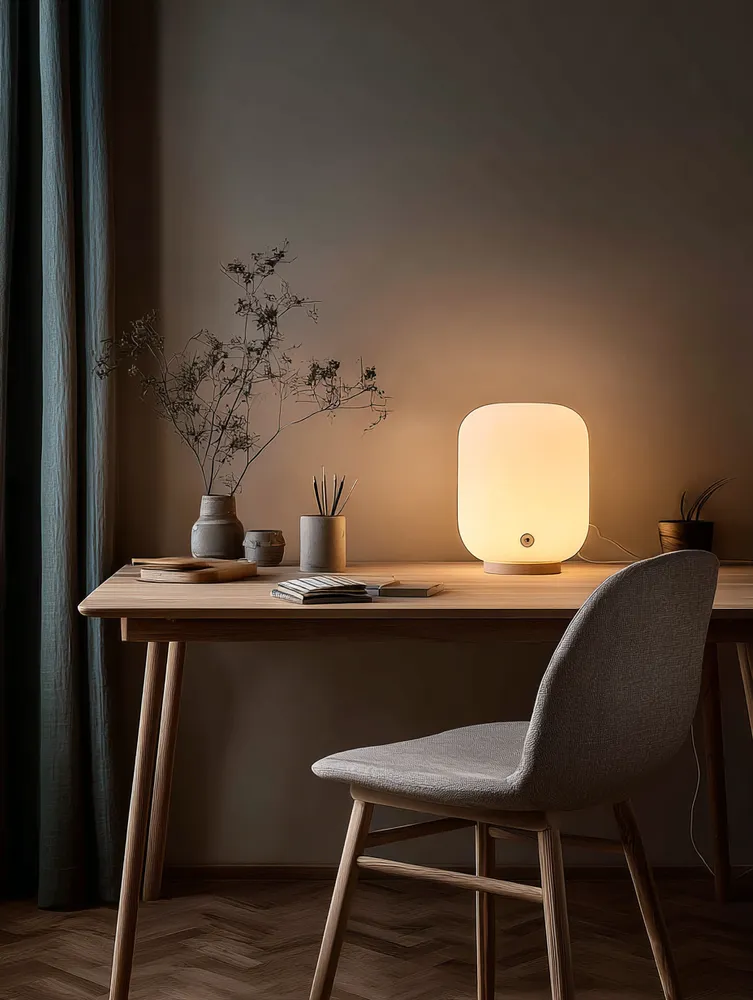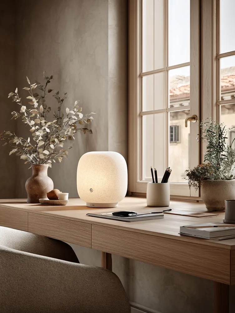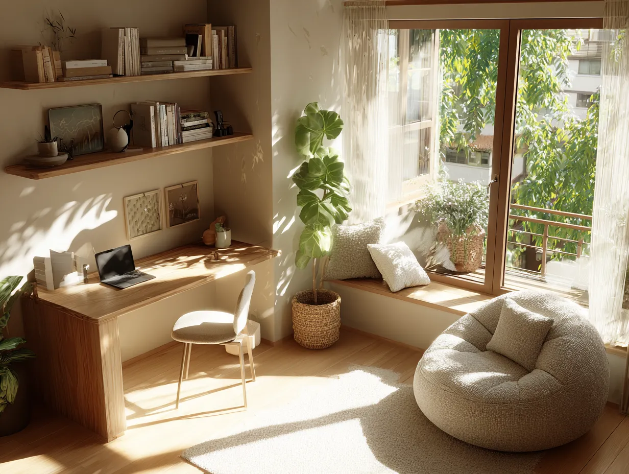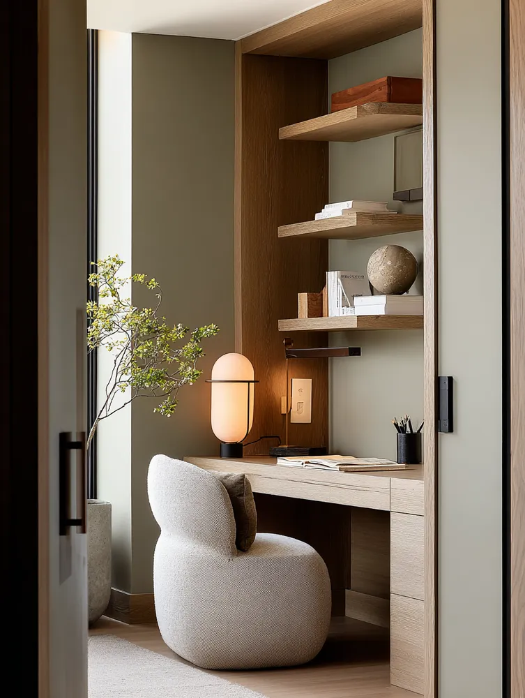 Design a home office that promotes focus and tranquility with Japandi style. This layout emphasizes clean lines, natural elements, and functional simplicity.