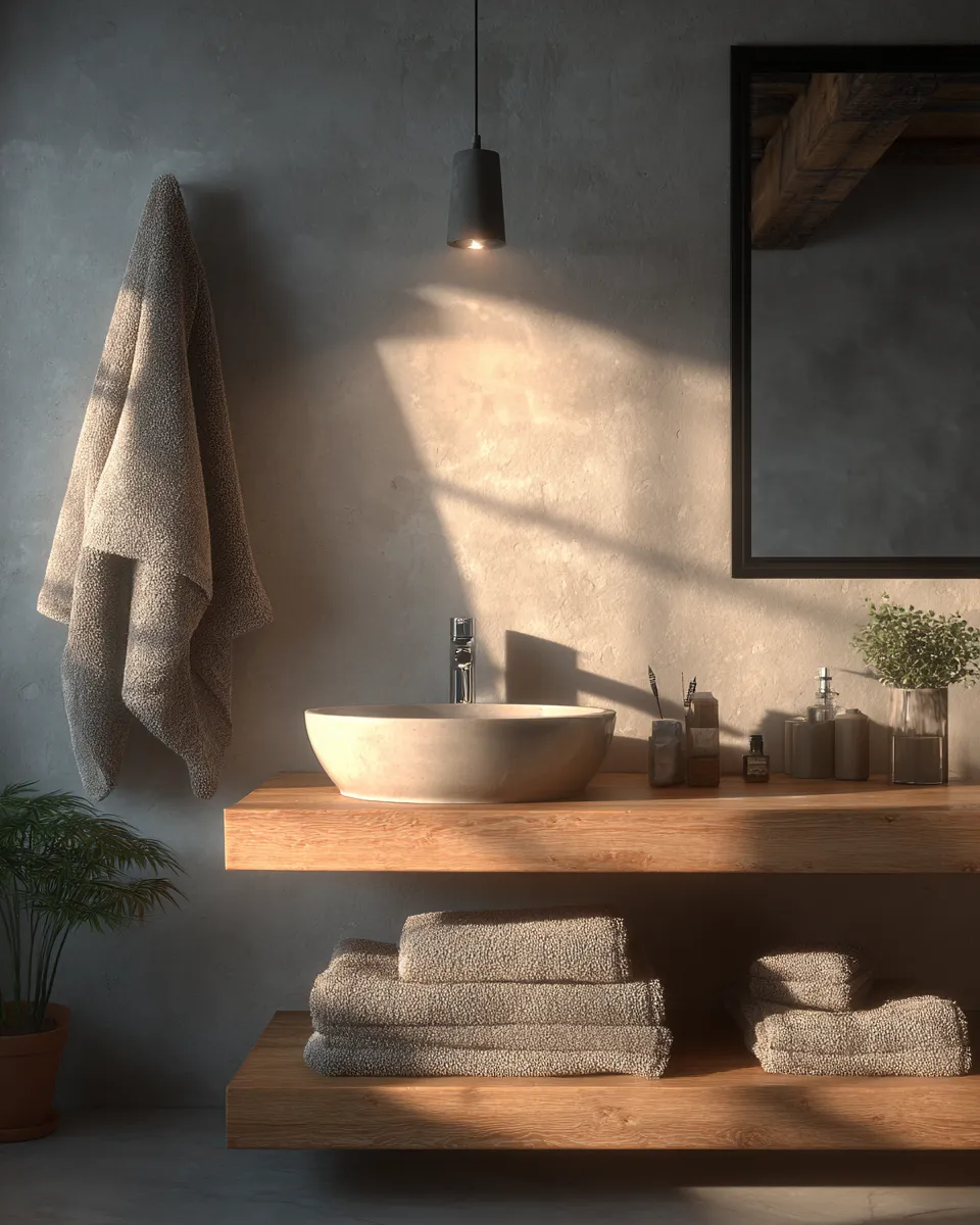 * **Soft Textiles:** Plush towels in neutral tones and a soft bathmat.