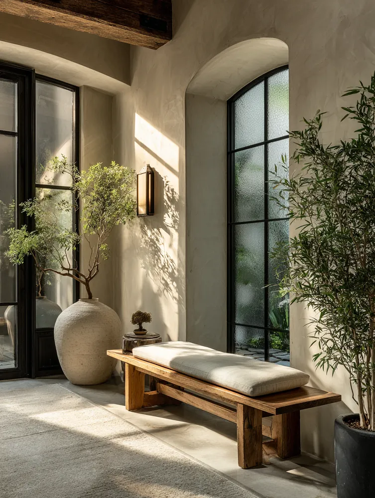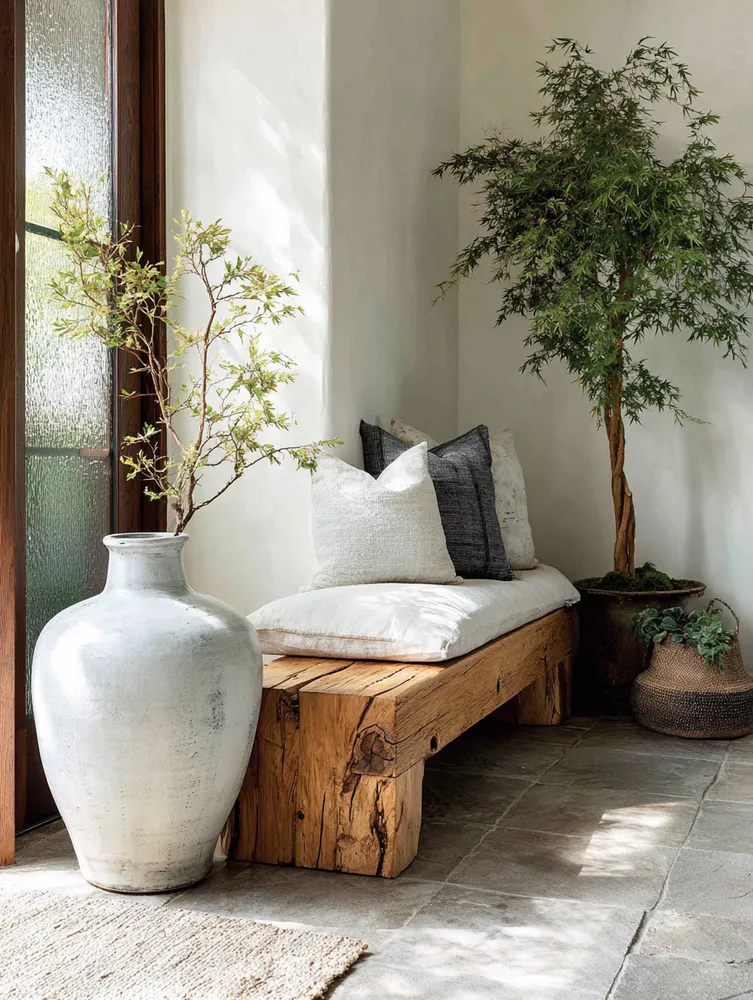 * **Functional beauty:** A bench for convenience, a decorative rug.