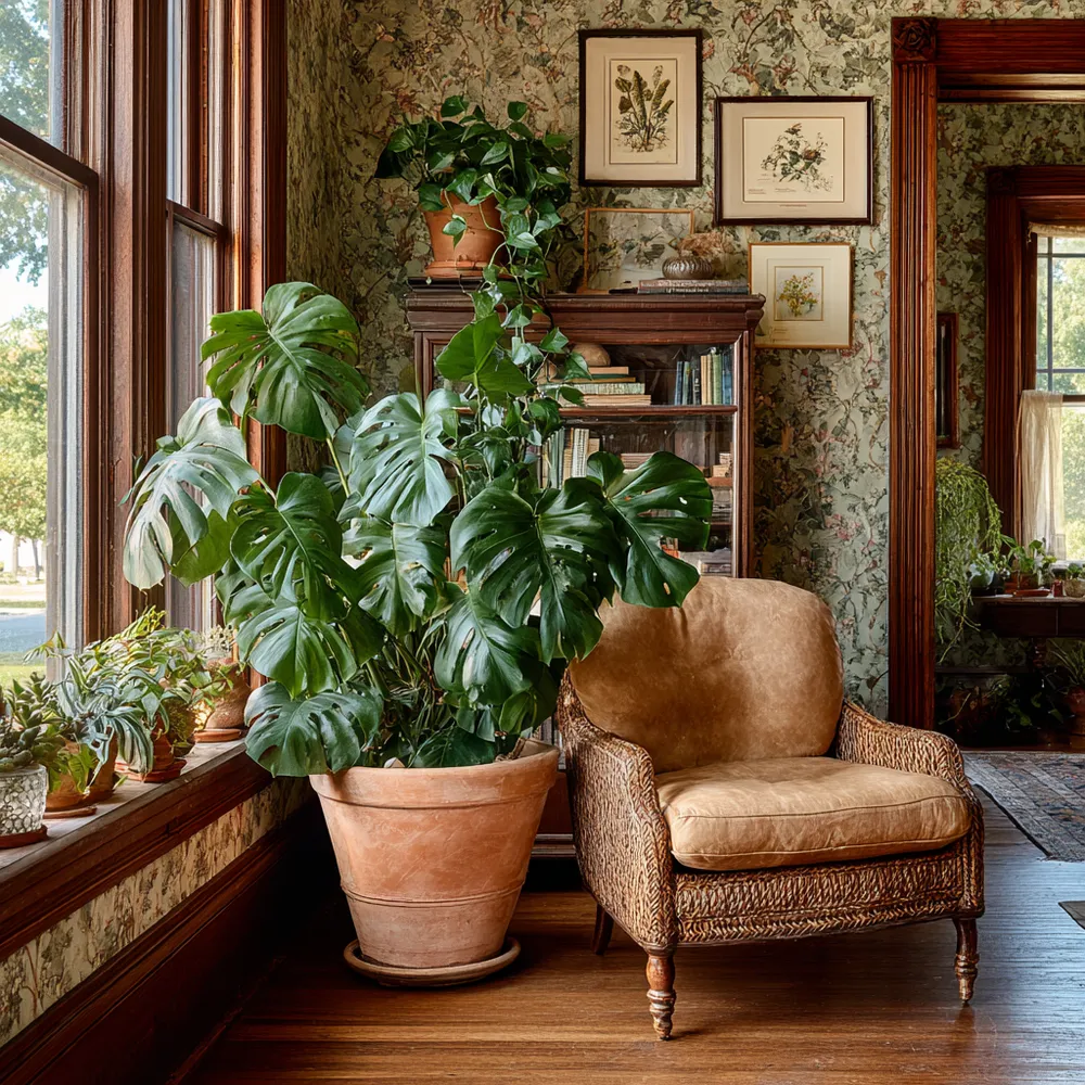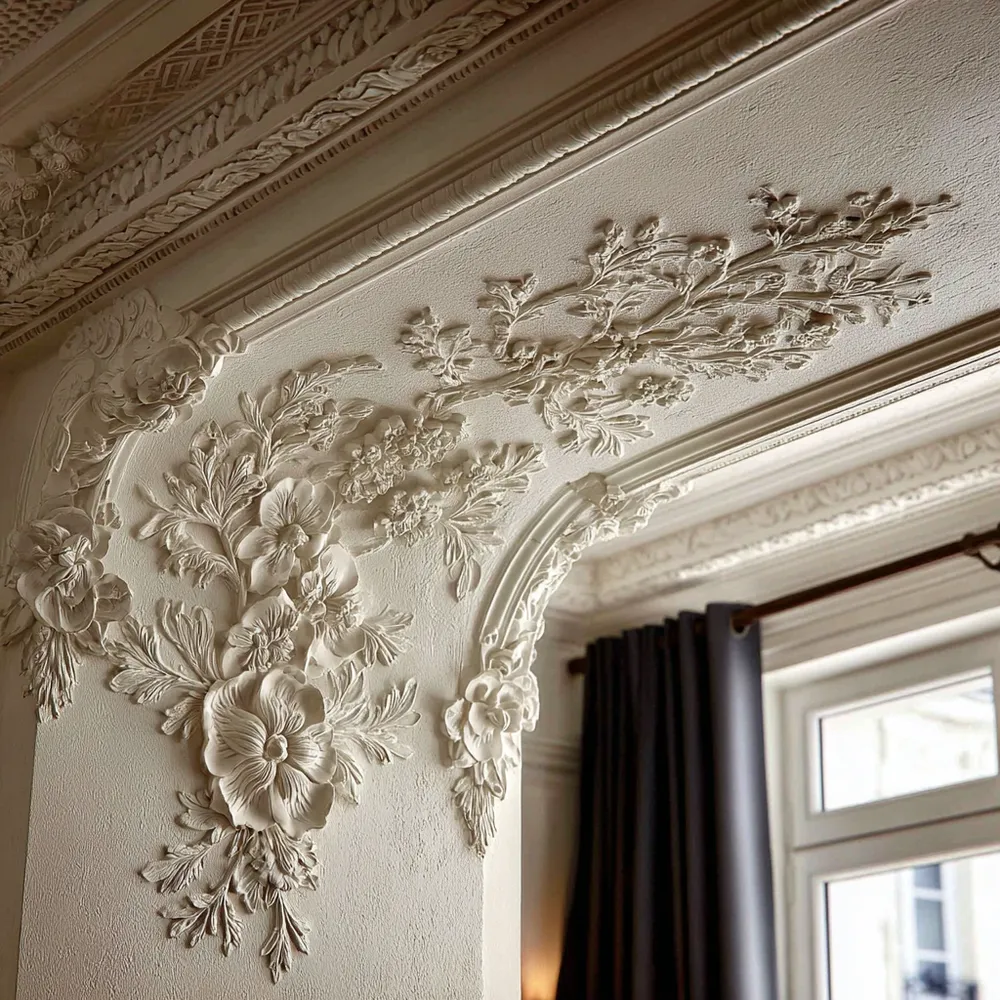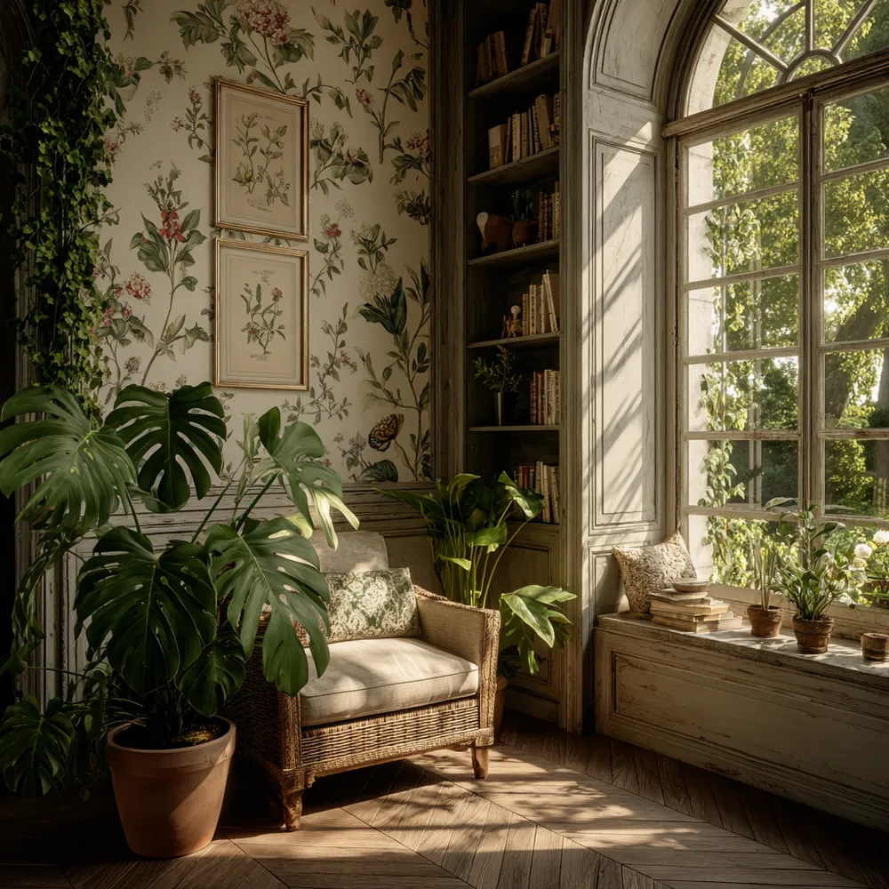 1. **Botanical Motifs:** Look for wallpapers, fabrics, or art featuring classical botanical prints, scrolls, or floral arrangements.