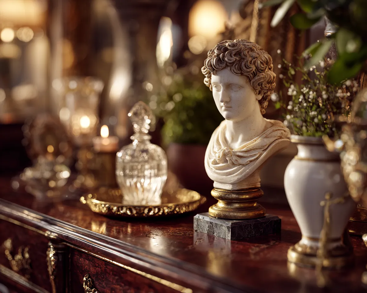 1. **Busts and Statues:** Small marble or plaster busts of classical figures add an artistic flourish.