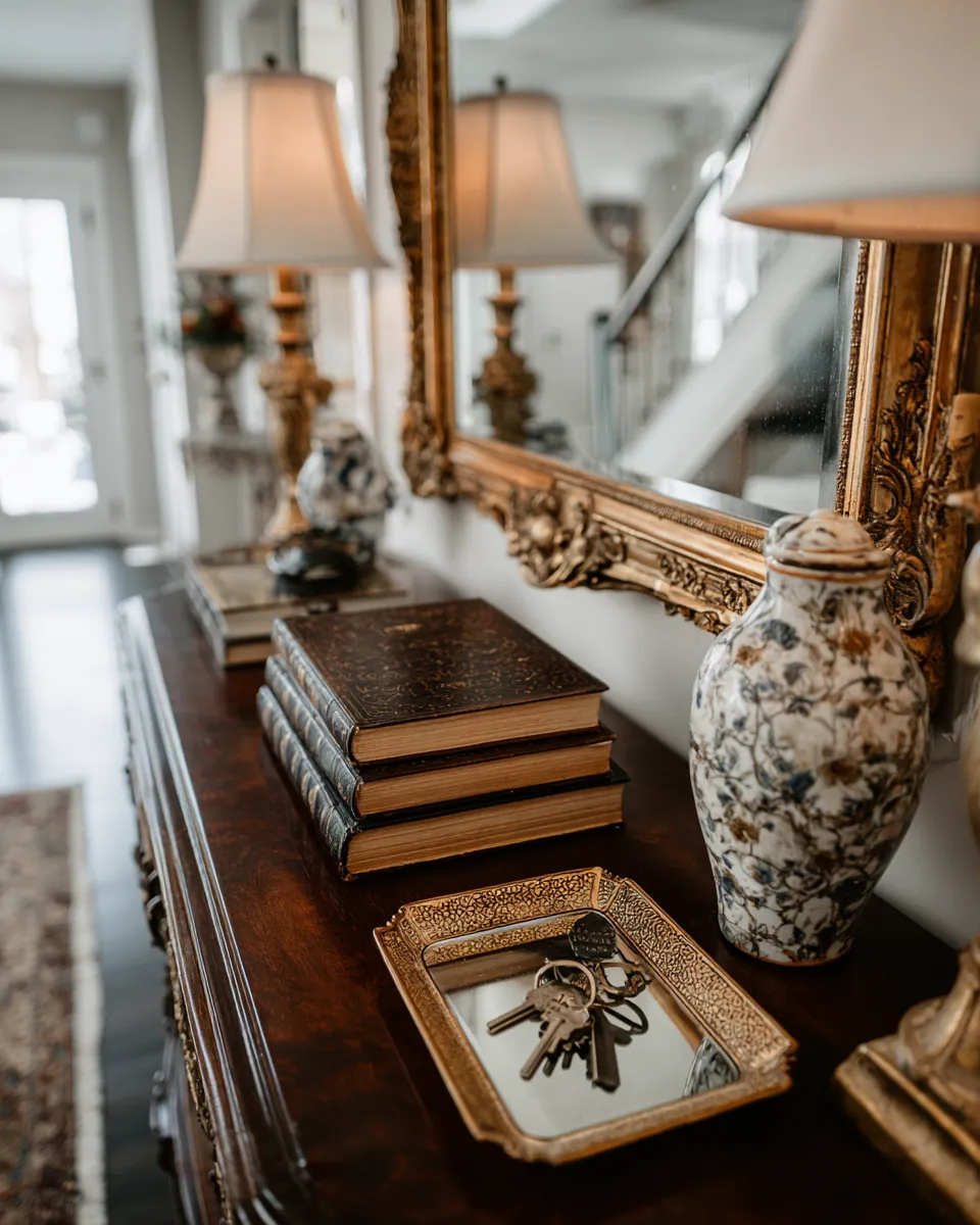 2. **Elevated Decor:** Use a statement mirror above, and artfully arrange items like antique books, decorative trays, or a curated vase.
