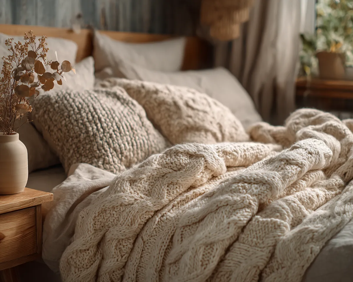 Focus on tactile materials: soft linen bedding, a chunky knit throw, and a textured rug made from jute or wool.