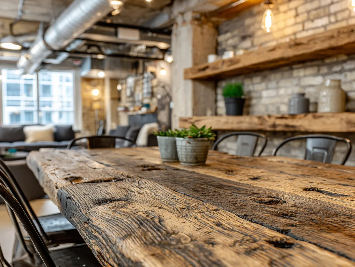This adds a grounded, soulful touch to any urban space. Save for your next design project! #ReclaimedWoodIdeas#LoftWoodIdeas#IndustrialDesignIdeas#RusticDecorIdeas#UrbanLoftIdeas#HomeInspo#IndustrialDecor#WoodFurniture#SalvagedWood#InteriorStyle