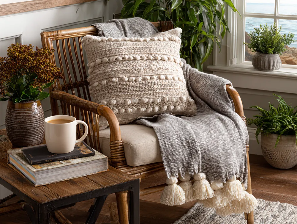 Craft your perfect reading nook with PNW charm! This space is all about combining a natural wood accent with incredibly cozy textiles for ultimate relaxation. 🪵✨