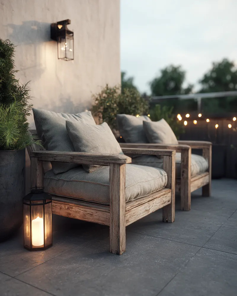 This is your personal sanctuary to unwind and connect with the outdoors. Save this for your outdoor living room inspo! #BalconyIdeas#PNWOutdoorLiving#OutdoorDecor#WoodFurniture#GreeneryDecor#PatioIdeas#ExteriorInspo#NatureInspired#SmallSpaceLiving#UrbanOasis