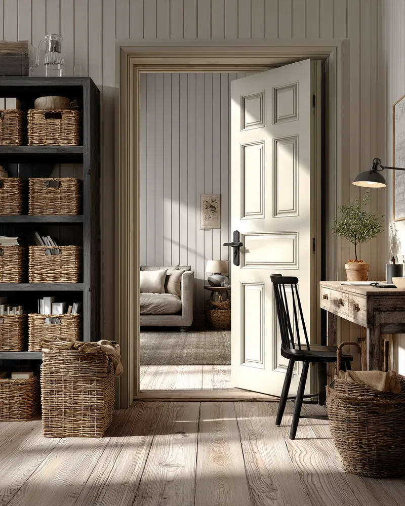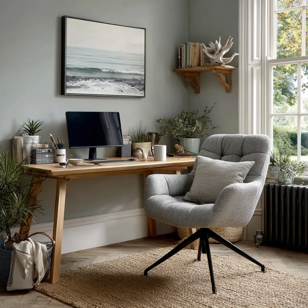 Craft a home office that promotes focus and tranquility by incorporating natural wood grains and abundant natural light. A solid wood desk, perhaps oak or maple, with its visible grain, grounds the space. Pair with simple, functional storage solutions made from natural materials. Position your desk to maximize natural light, which not only boosts productivity but also creates a more inviting atmosphere. This 'Terra Firma' approach ensures your workspace feels connected to nature and conducive to calm, productive work. Create your inspiring retreat! 🌿