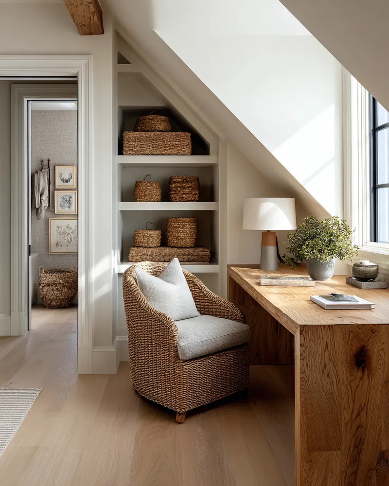 Design a home office that inspires productivity and calm, California style. It’s about blending function with a serene, light-filled aesthetic. Choose a minimalist desk made from light wood or with a natural finish. Pair it with an ergonomic chair that doesn't compromise on style. Incorporate ample natural light and soft task lighting. Keep clutter at bay with smart storage solutions, like woven baskets or sleek wall shelves. Add personal touches with plants and calming artwork. This space should feel both inspiring and peaceful. Save this for your dream workspace!