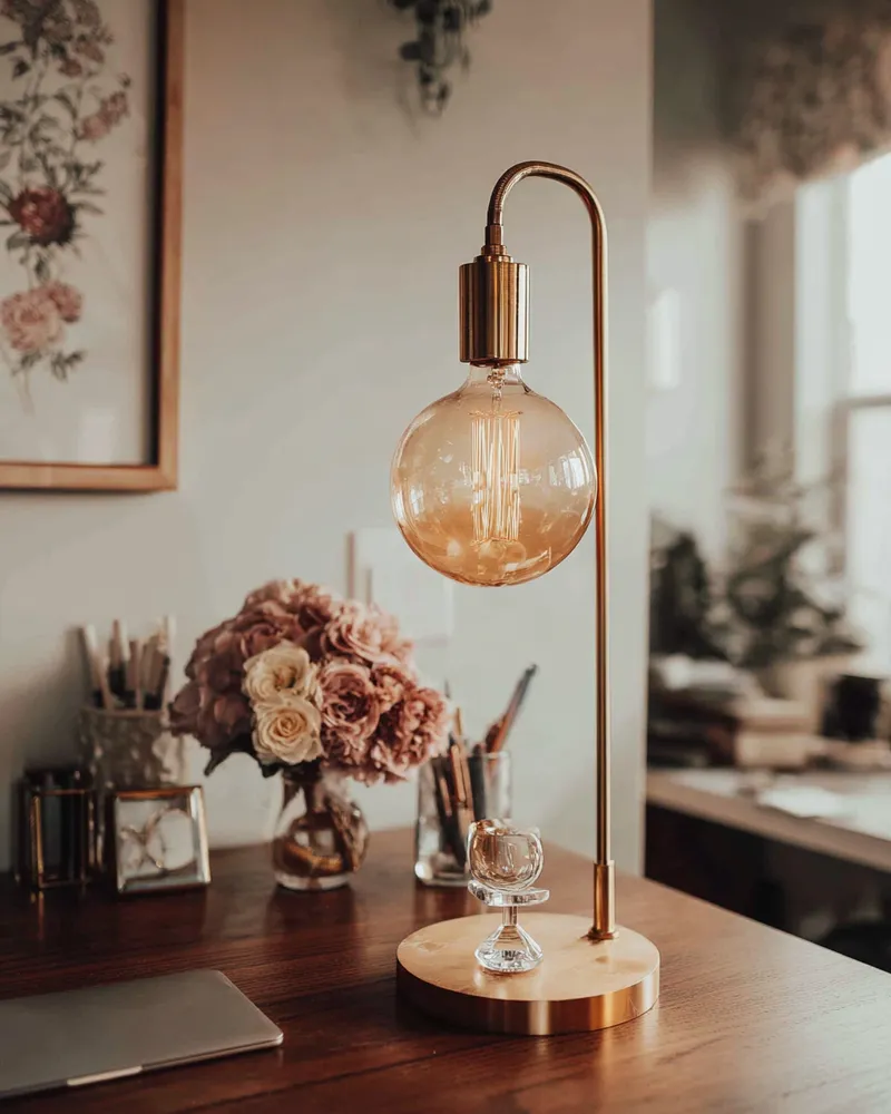 Bring sophistication and a touch of nature to your workspace! Let's infuse your home office with 'The Brass Bloom' aesthetic. Think a sleek brass desk lamp casting a warm glow, a minimalist brass organizer for pens, and perhaps a framed piece of botanical art. 🌿 Add a small vase with a single, elegant flower or a lush mini plant on your desk. This creates an inspiring and calming environment that fosters creativity and productivity. Save for your home office upgrade!