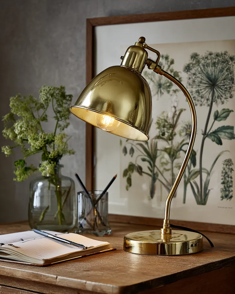 Transform your study into a sophisticated sanctuary with 'The Brass Bloom' aesthetic! Infuse warmth and elegance with polished brass details and hints of floral inspiration. A sleek brass desk lamp illuminating your workspace, a beautiful brass letter opener, or decorative brass bookends can make a world of difference. 📚 Pair these with a small bouquet of dried flowers or a delicate botanical print. This creates an environment that encourages focus and refined creativity. Save for your study refresh!