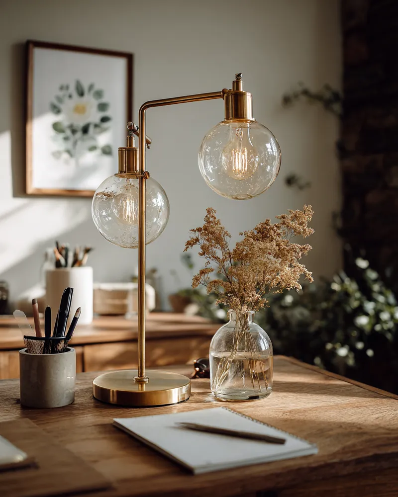 Elevate your workspace with a touch of natural glamour! I love incorporating brass accents and floral-inspired elements into my home office to create a truly inspiring environment. Think a sleek brass desk organizer, a vintage-inspired brass lamp, and perhaps a beautiful framed print of delicate botanicals. 🪴 Adding a small vase with fresh flowers or a mini plant brings life and vibrancy. This creates a harmonious blend of productivity and beauty. Save for your office redesign!